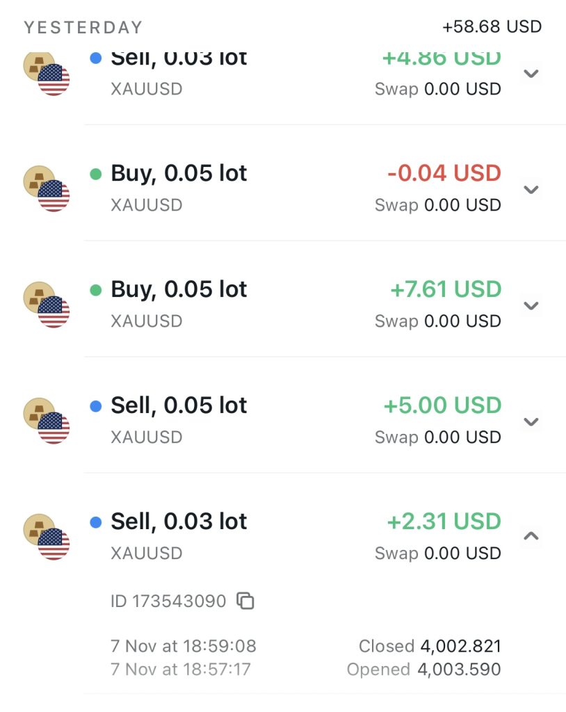 Good morning, gold legends! Seal the week with the XAUUSD Profit Wrap on tradegoldnow.com, where yesterday, Friday, November 07, 2025, delivered a crisp $58 profit via my Exness copy trading system. This final gain came amid China Export Growth at -1.1% (miss vs. 3% forecast) and Germany Trade Balance at 15.3B (soft vs. 16.7B), while US data stayed blocked by the ongoing government shutdown. Today, Saturday, November 08, 2025, markets are closed, with XAUUSD last at 3,977 (low 3,974, high 3,994). Check the proof below —your weekend finale! New to trading? Learn how to start copy trading XAUUSD with Exness in just 5 minutes! Click here to get started.